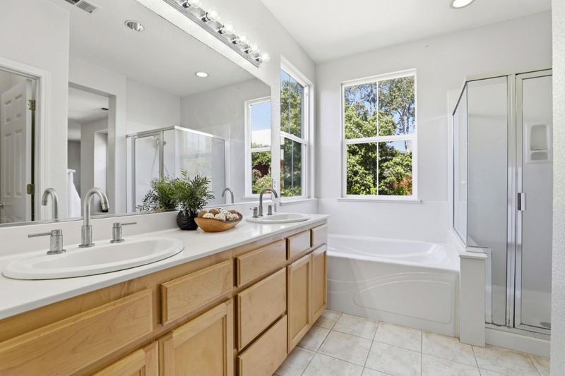 Double Sinks, Half on Ground Floor, Primary - Oversized Tub, Primary - Stall Shower(s), Shower and Tub, Tile, Tub in Primary Bedroom