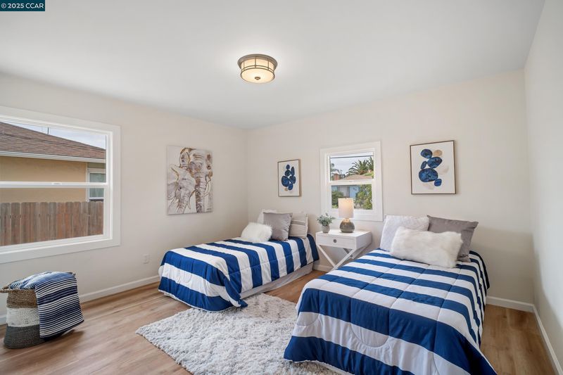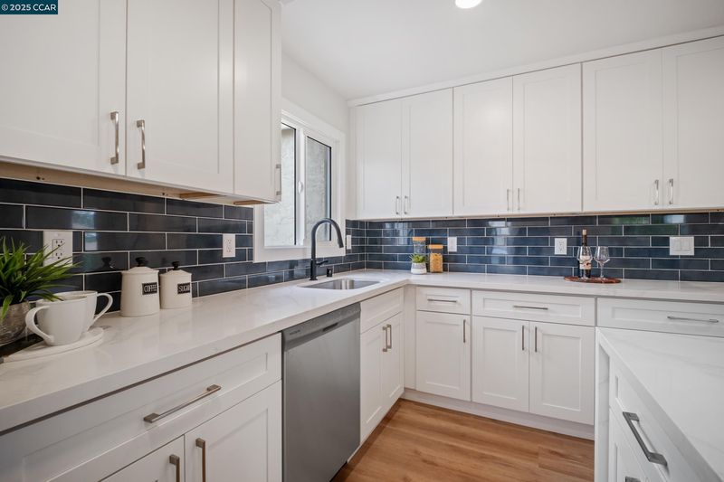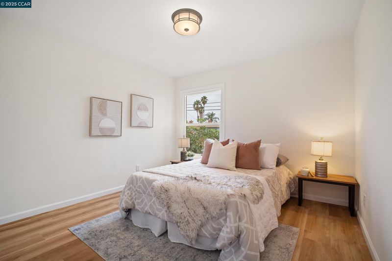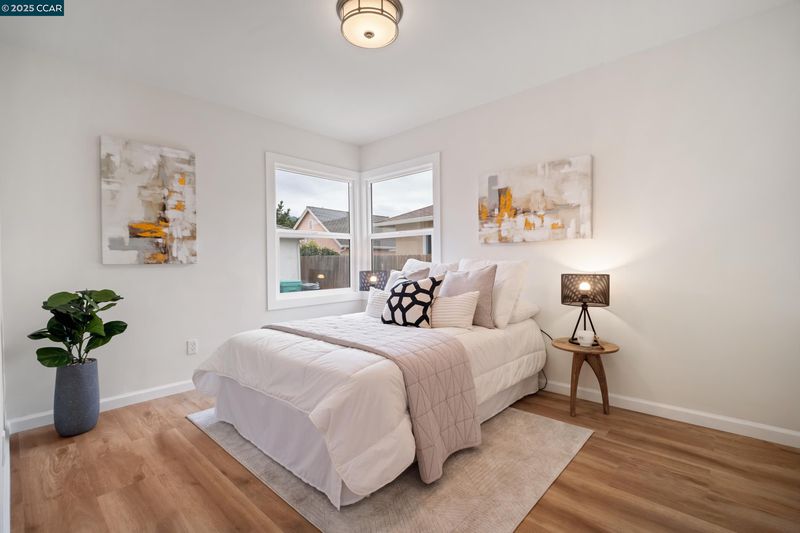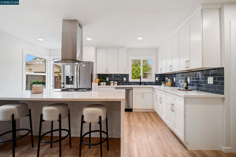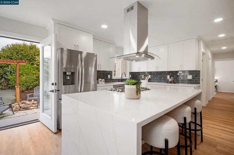 Step inside this beautifully updated San Leandro home offering 3 bedrooms and 2 stylishly renovated bathrooms in the main house. Newly painted inside and out, and recently updated with new flooring, lighting, + much more! This home features a light-filled living room with cozy fireplace that flows into the dining area and stunning kitchen. The kitchen is designed for both cooking and entertaining, complete with white shaker cabinets, a statement blue tile backsplash, stainless steel appliances, a floating hood, and a gas range for every culinary delight. The expansive quartz waterfall island doubles as a breakfast bar for casual seating. Unwind in either spa-like bathroom, choose from a walk-in shower or luxuriate in the tub. The generous bedrooms provide comfort and flexibility for your needs. Step outside and find inviting yards with mature fruit trees, garden beds ready for planting, a private well, and a serene seating area. This home also includes a 630 SF detached ADU with a flexible 4th bedroom, 3rd full bath, living area, and office, perfect for extended family, guests, or rental income. Located near Lake Chabot, parks, shopping, dining, commuter routes and transit, this home blends modern style with everyday functionality. Come experience all this San Leandro gem offers.