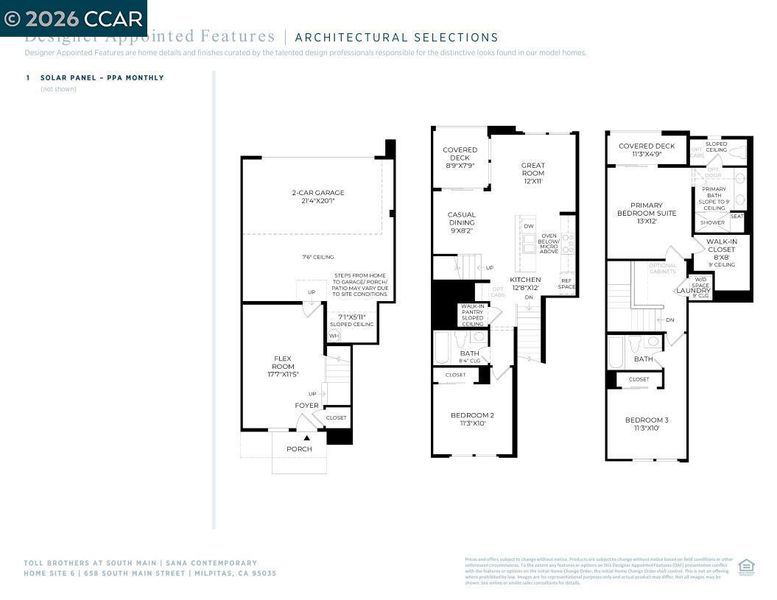 Find your new luxury home at South Main, an exclusive all-electric community of new townhomes in Milpitas. This home blends comfort and style across three thoughtfully designed levels. The entry leads to a spacious first-floor flex room. Second floor, open-concept main living area connects the great room, kitchen, and casual dining space. Kitchen features a center island, stainless steel appliances, walk-in pantry, while sliding doors open to a covered deck—ideal for outdoor dining or entertaining. Secondary bedroom with access to a full hall bath offers a welcoming space for guests or family. Upstairs, the private primary suite includes a generous walk-in closet and a spa-like bath with dual-sink vanity, a shower with seat, and a private water closet, covered deck extends the suite outdoors. Secondary bedroom with a private bath. Intimate enclave boasts a community park with tot lot, picnic areas. Its central location provides walkability to world-class shopping, dining, recreation such as Great Mall, Big Dog Vineyards, and Hidden Lake Park. Near the new Milpitas Transit Center featuring BART / VTA and convenient access to highways 680 / 880 / 237. ( photos not of actual home, for marketing only)