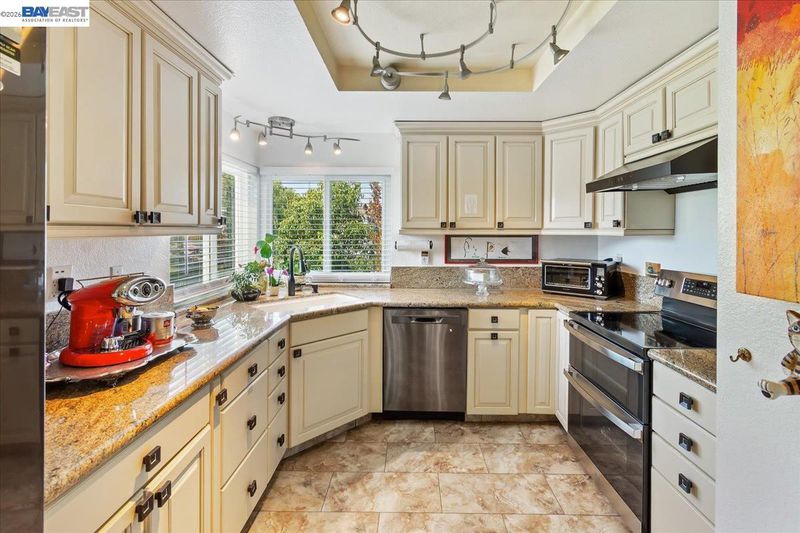- Dishwasher, Electric Range, Microwave, Refrigerator, Dryer, Washer, Stone Counters, Eat-in Kitchen, Electric Range/Cooktop, Disposal, Updated Kitchen
