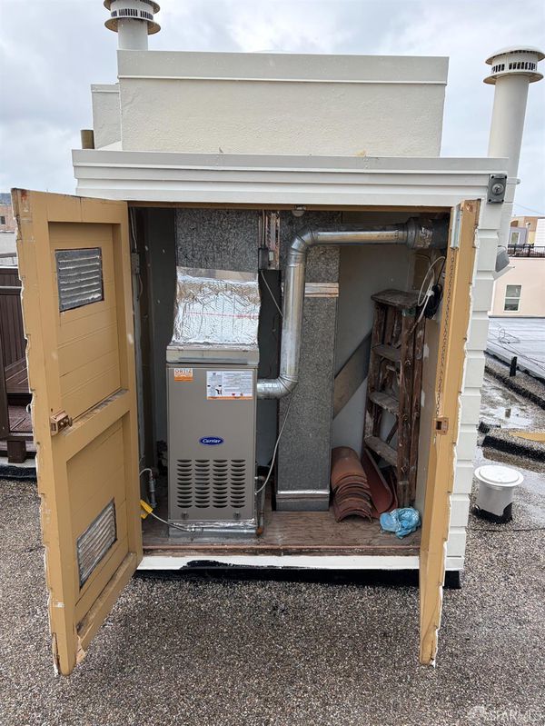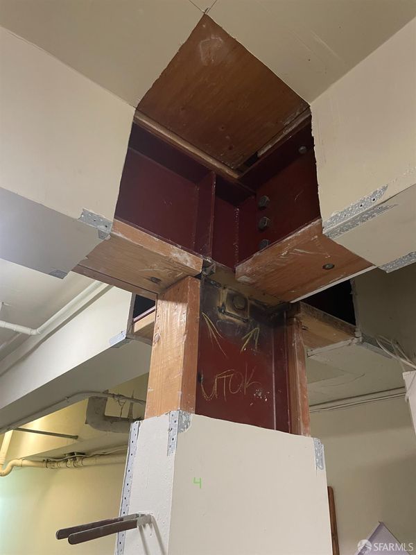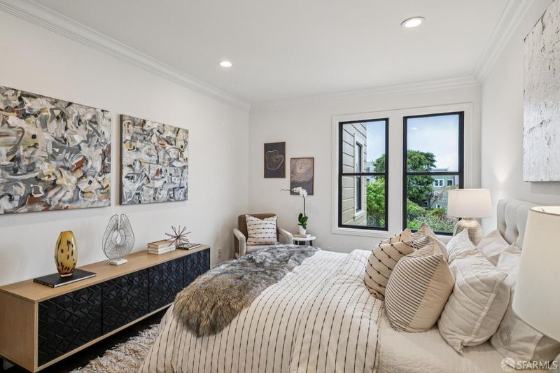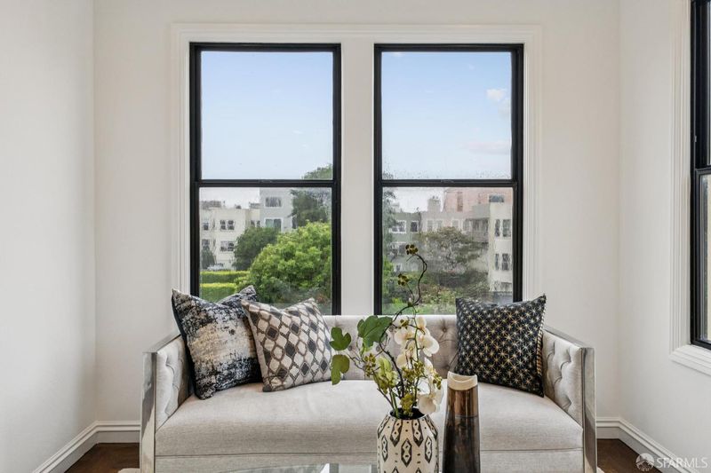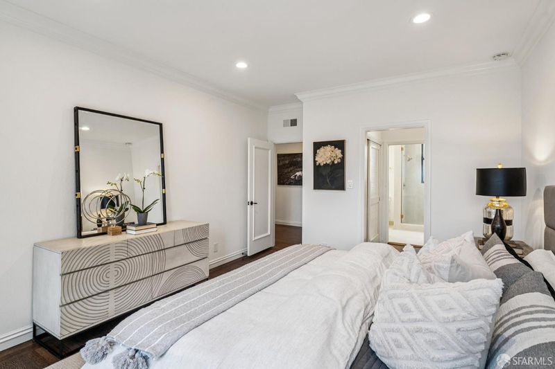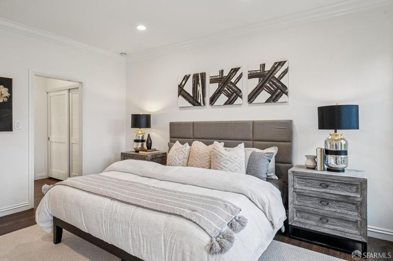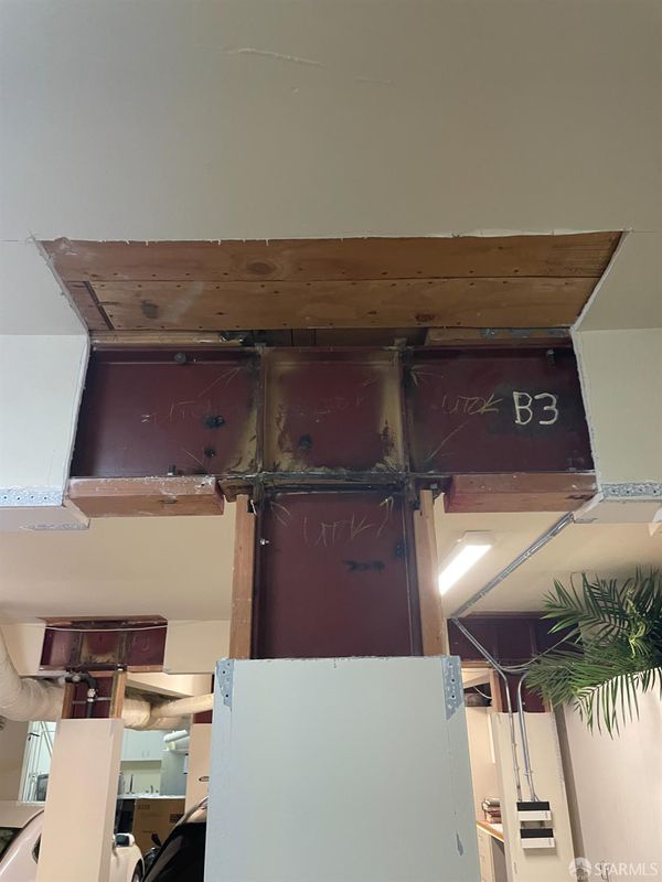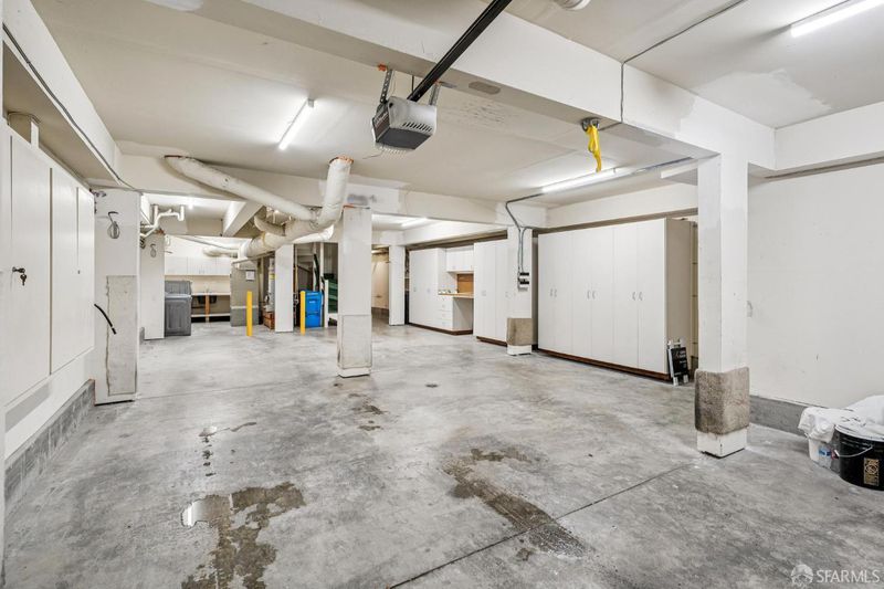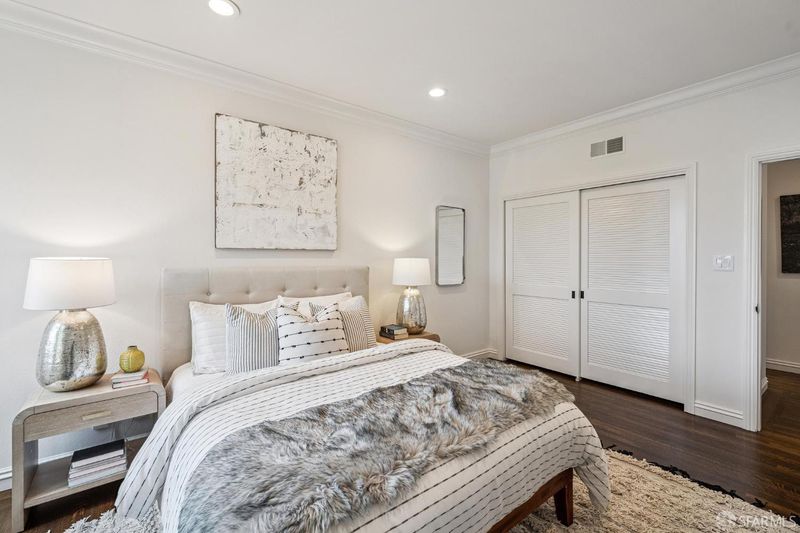 Classic Marina Flat built in 1934. A $1,800,000 renovation was completed in 1992 by Mayta & Jensen after the Loma Prieta earthquake. The concrete slab and foundation were replaced. Seismic upgrades included: Double mat steel re-enforced 12 inch thick concrete slab, six moment frames running from the front to the back of the building, Steel I Beams for the entire perimeter between garage and first floor flat linking the moment frames, hold downs and 10 sheer walls on both the second and third floors. The major systems including the electric, plumbing and heat were updated. A lower level was added to the first floor flat.The major systems including the electric, plumbing and heat were updated. New kitchens, baths, lighting, a roof deck and a lower level was added to the first floor flat. In preparation for the sale of the home, the interior was painted and the hardwood floors were refinished. An entry foyer with parquet hardwood floors opens to the public rooms. The living room has parquet hardwood floors, a wood burning fireplace with gas starter & built in cabinets, a vaulted 10+ foot ceiling, recessed lighting, sconces and tall east facing windows which open to a balcony. The formal dining room has a chandelier, recessed lighting and French Doors that open to a lightwell balcony.The sunny kitchen has a wall of south facing windows.There is a breakfast nook, new quartz counters with a seating area and new appliances (hood, refrigerator, washer and dryer, sink, a stacked washer/dryer faucet). Two bedrooms with hardwood floors are located at the rear of the flat and have views to the west overlooking a city block of neighboring gardens. The principal bedroom has a sun room with a Trex deck and two closets The principal en suite bathroom has new microcement finishes to the floors and to the shower & bath tub surrounds; a new counter, wall sconces, sink and cabinet are additional features. The second bedroom is spacious with a large closet. There is a guest bathroom with tile floors and shower surround off the hallway.There is a walk in closet in the formal entry hall. An interior stairway off the kitchen leads up to a 339 square foot roof deck with new Trex decking. The kitchen stairway also descends to the garage. See condo plan for exclusive use parking (P-2), storage room (S-3), storage cabinets (S-2), roof deck (D-5). Dining room deck (D-3) and primary bedroom deck (D-4).