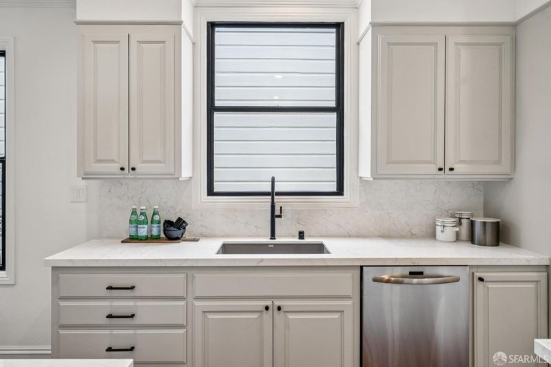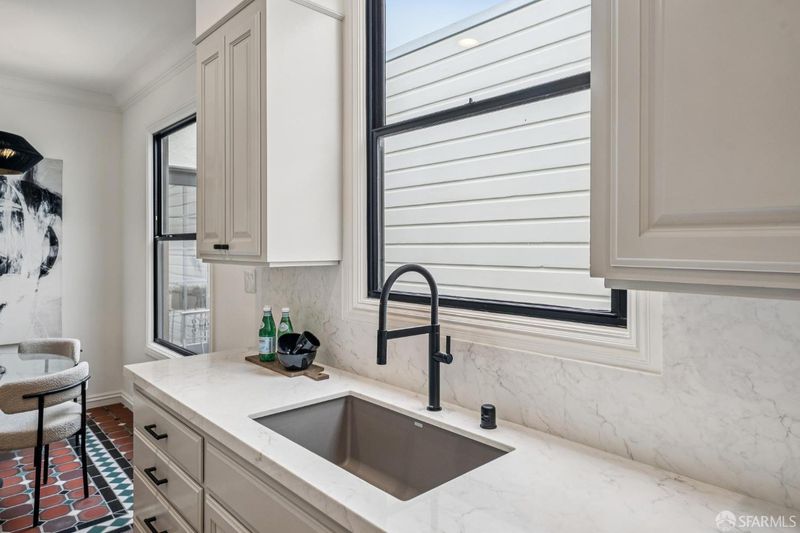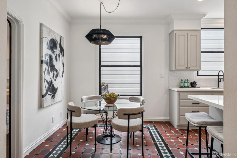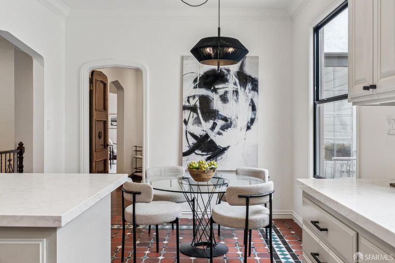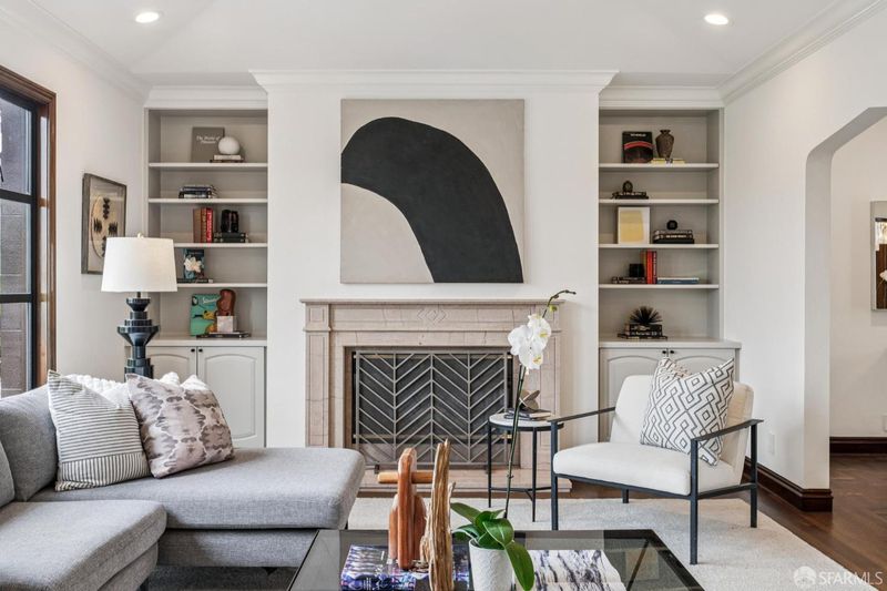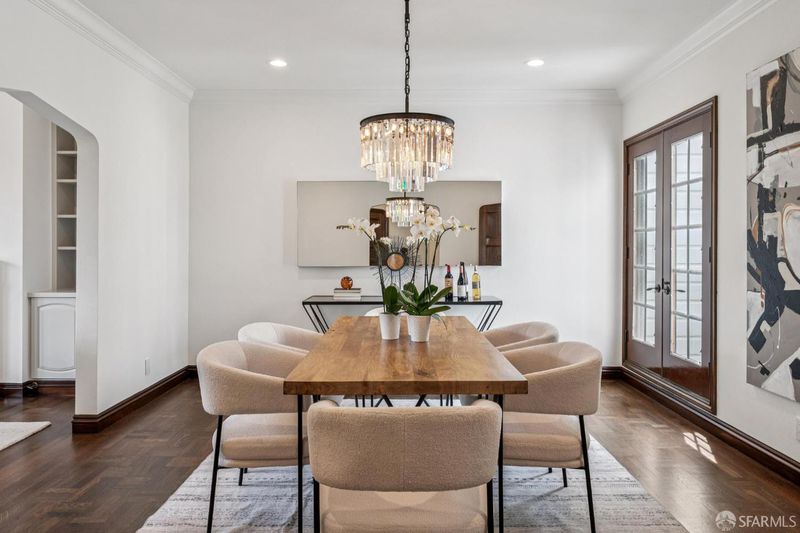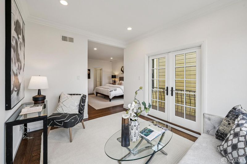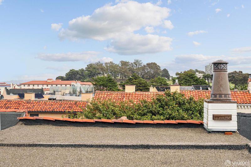 Classic Marina Flat built in 1934. Living room has parquet floors, a wood burning fireplace with gas starter, built in cabinets, a vaulted 10+ foot ceiling, recessed lighting, sconces and tall east facing windows which open to a balcony. Formal dining room has a chandelier, recessed lighting and French Doors that open to a balcony.The sunny kitchen has a wall of south facing windows, a breakfast room, new quartz counters with a seating area & new appliances:hood, refrigerator, washer & dryer, sink, a stacked washer/dryer faucet. Two bedrooms with hardwood floors are located at the rear of the flat and have views to the west overlooking a city block of neighboring gardens. The primary bedroom has a sun room with a Trex deck and two closets The principal en suite bathroom has new microcement finishes to the floors and to the shower & bath tub surrounds; a new counter, wall sconces, sink and cabinet are additional features.An interior stairway off the kitchen leads up to an exclusive use Trex roof deck. The kitchen stairway also descends to the garage where there is parking for 1 car, a store room and storage cabinets.