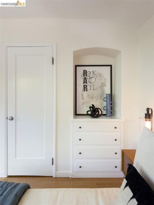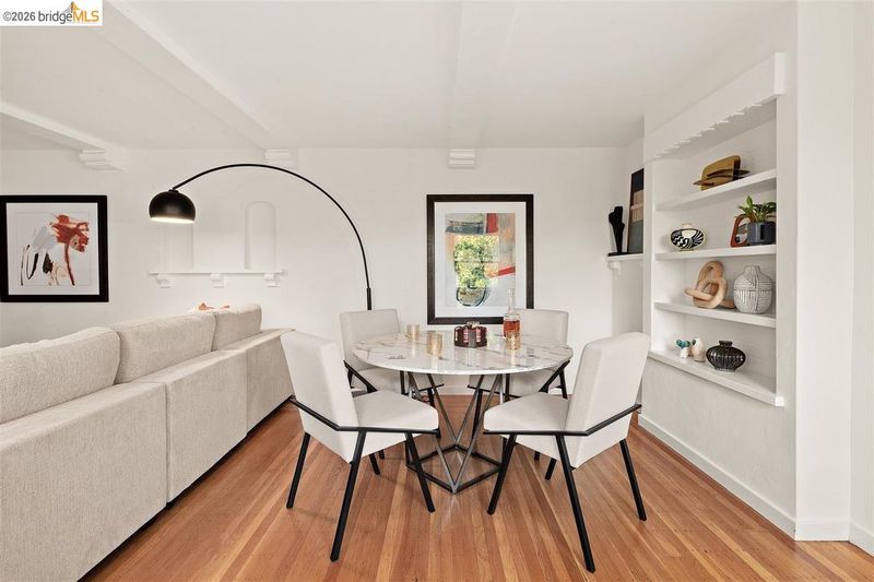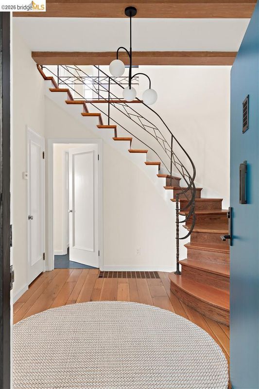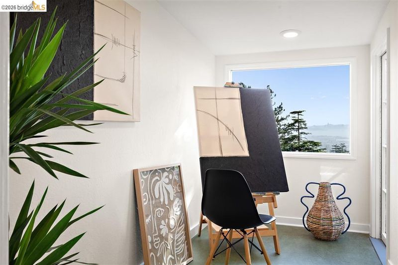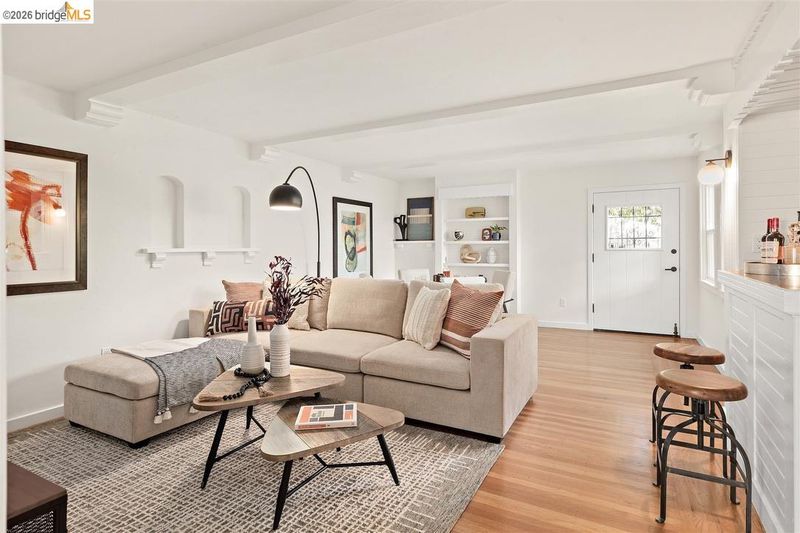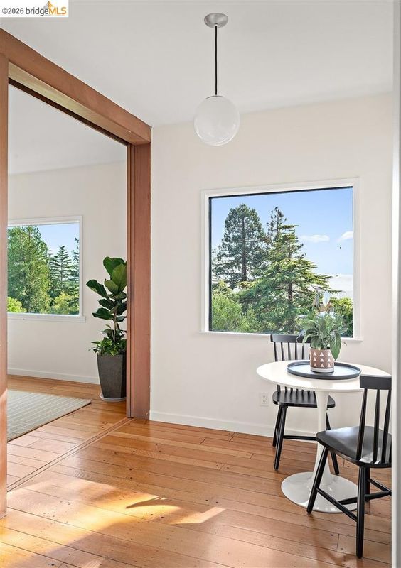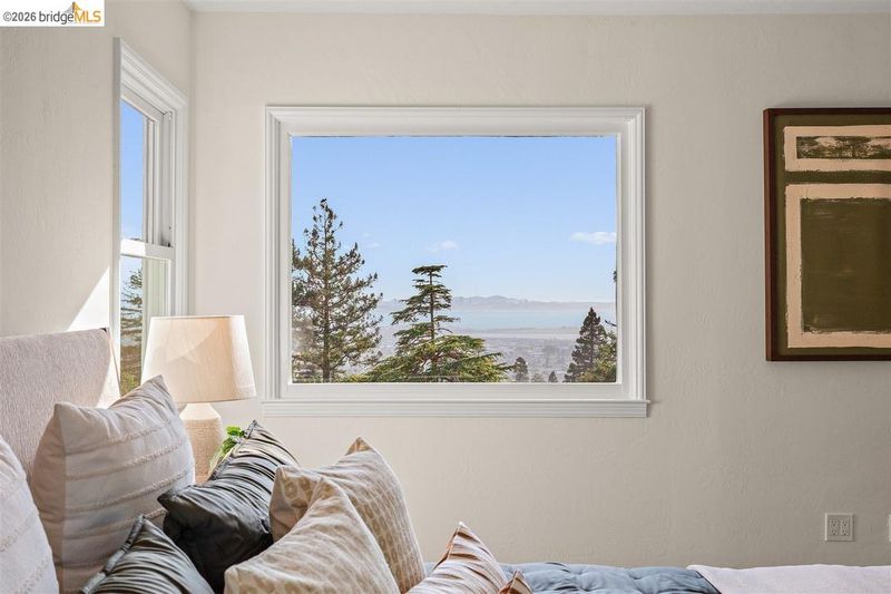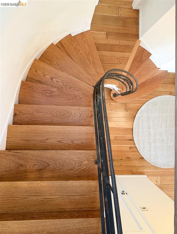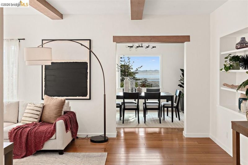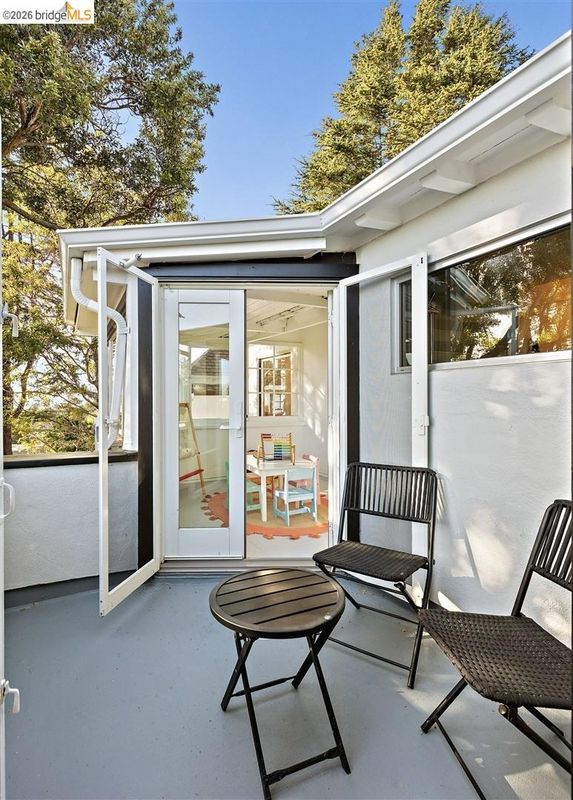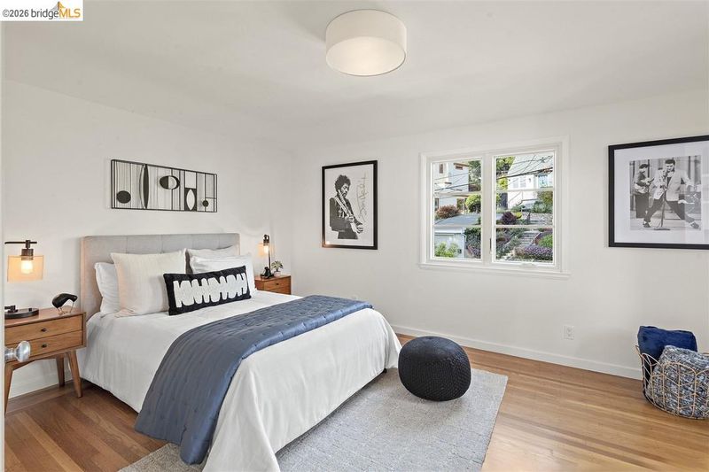 Located on a quiet, tree lined street in Upper Thousand Oaks, this 5 bedroom, 4.5 bath home offers Bay views and timeless architectural detail. Hardwood floors, beamed ceilings, built ins, and alcoves are paired with thoughtful updates. Spacious living and dining rooms and a well appointed kitchen create easy flow for everyday living and entertaining. A curved staircase leads to an ensuite bedroom on the first landing. Upstairs, the primary suite features an updated bath and a sitting room that opens to a view deck. Two additional bedrooms, a playroom, and an updated bath complete the level. The lower level offers a large family room with wet bar, an ensuite bedroom, and garden access. Laundry, storage, and a two car garage with interior access add function. The backyard offers mature landscaping and space to relax or garden. Upgrades include electrical, helical pier foundation, Andersen windows, and solar. Close to Arlington shops, Solano Avenue, transportation, and Tilden Park. BESO energy score 8.
