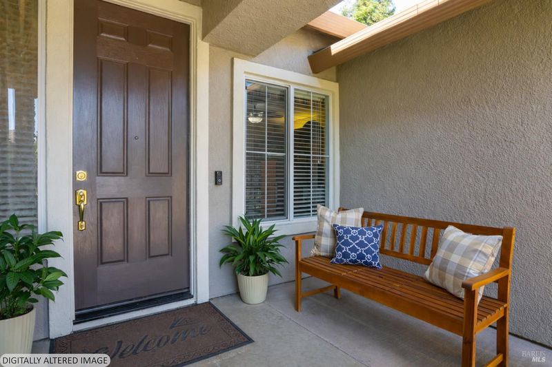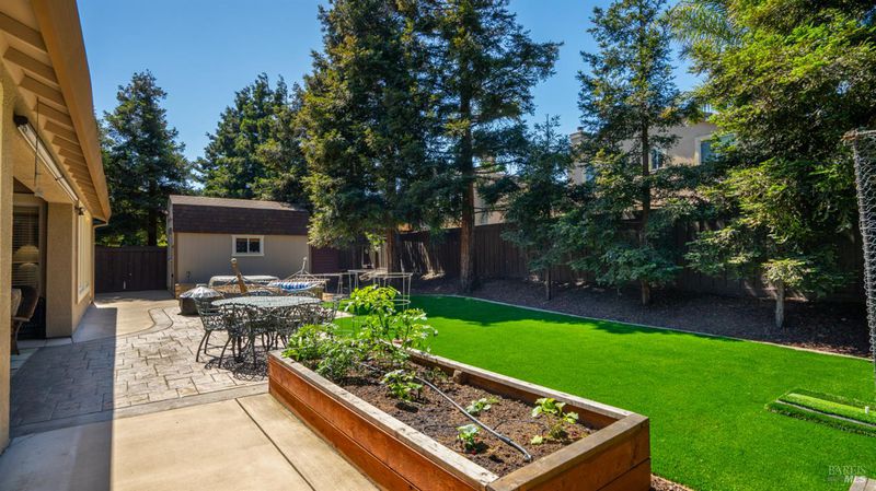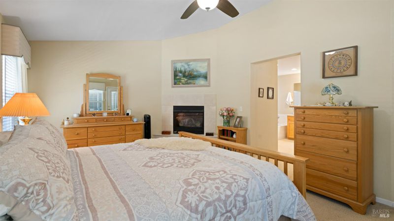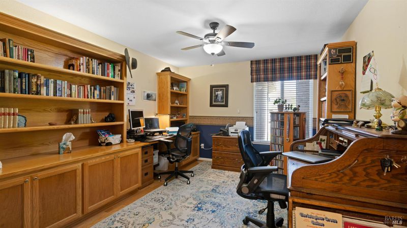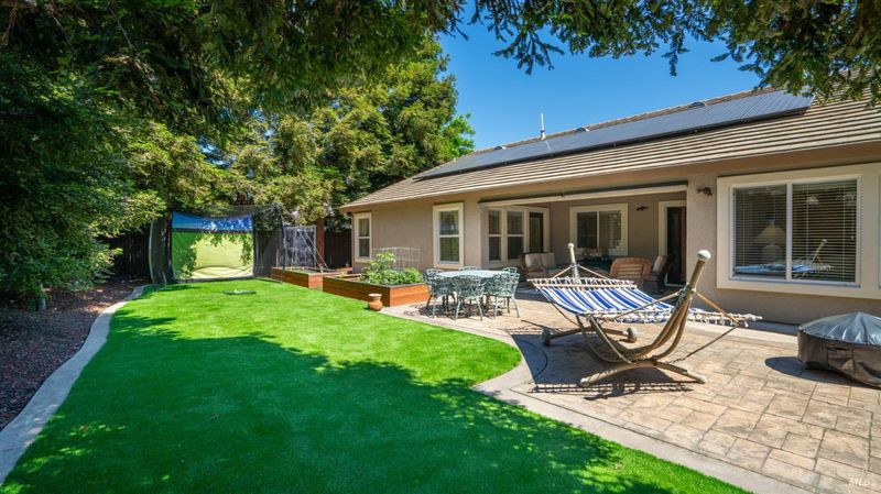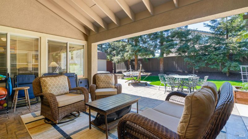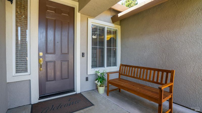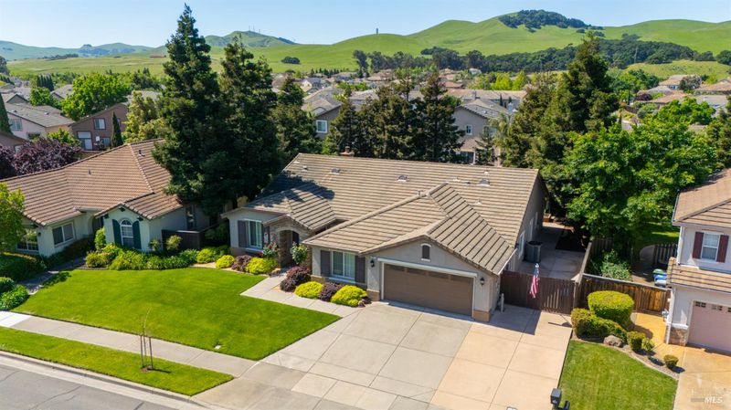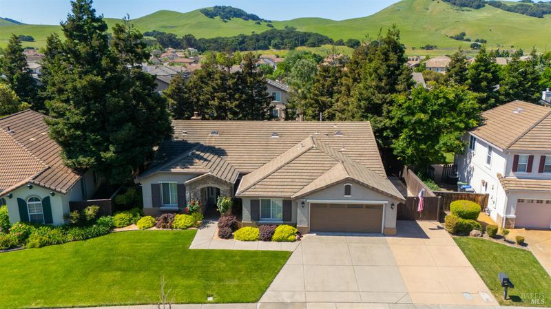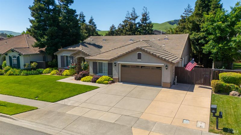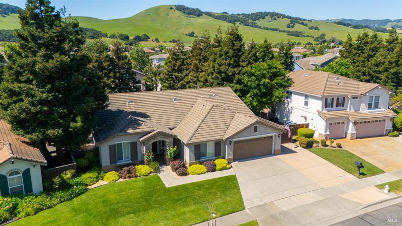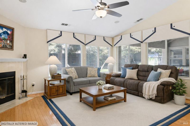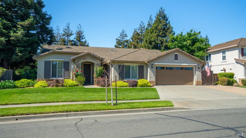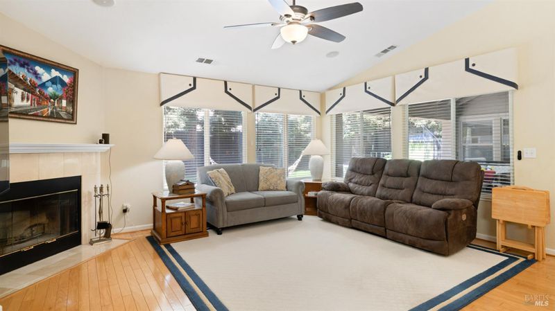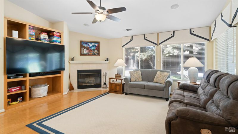 Located in the desirable Vintage Green Valley neighborhood, this single-story former model home offers a private, light-filled retreat on a generous lot with mature trees. The heart of the home is an updated kitchen featuring new countertops, a four-burner cooktop, wall-mounted oven, and a breakfast bar, flowing seamlessly into a family room with a cozy fireplace and built-in entertainment center. French doors open to a peaceful backyard oasis with a covered stamped-concrete patio and low-maintenance turf. Both inside and outside there is plenty of room for entertaining, relaxing, and making memories. Flexible living spaces include a den with a built-in office suite and a primary bedroom boasting its own fireplace and backyard access. High-value practical upgrades include paid-off solar, a new heat pump/furnace, new overhead ceiling fans, and new LeafFilter gutter system. With a two-car garage, storage shed/workshop, and RV-capable side access, this home combines luxury with convenience, situated just minutes from the Green Valley Country Club, shopping, dining, library, and commuter routes to Napa or the Bay Area.