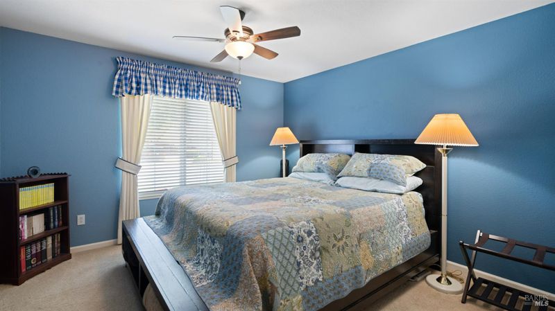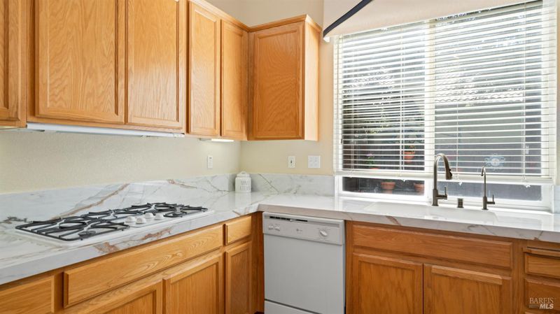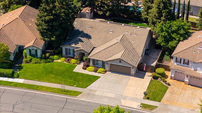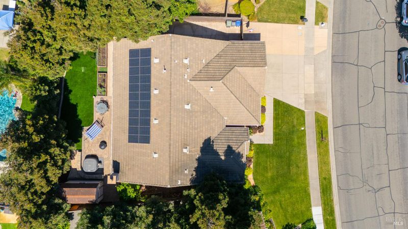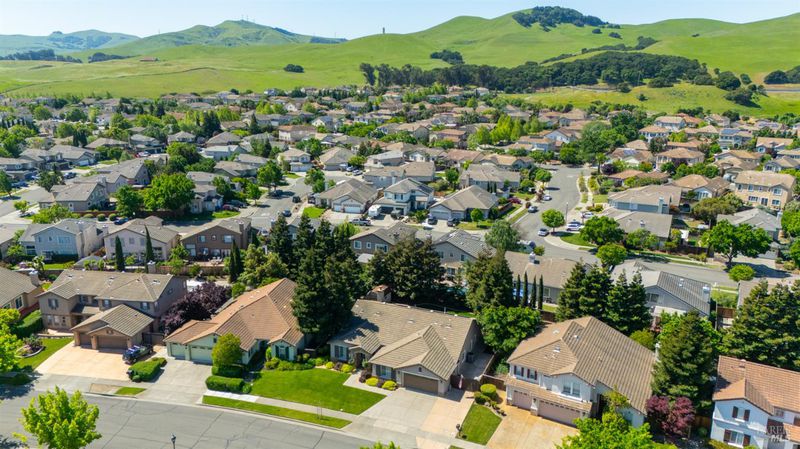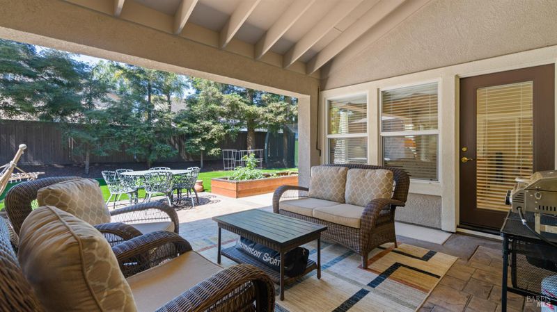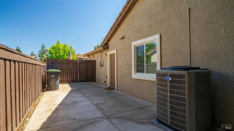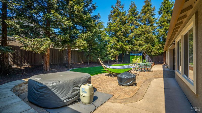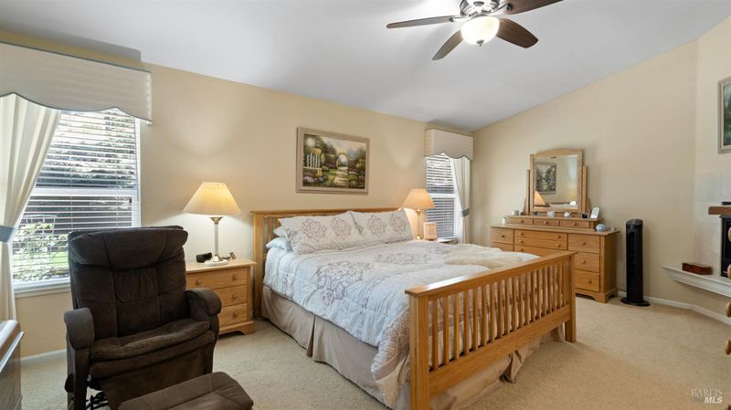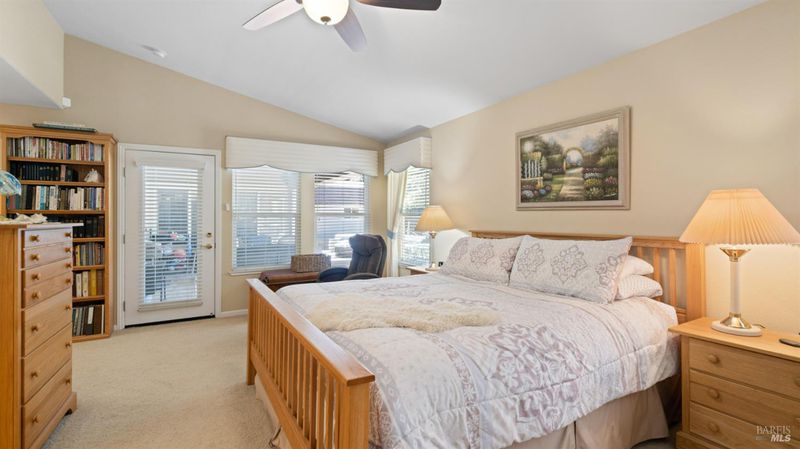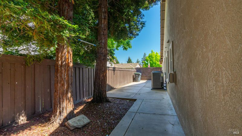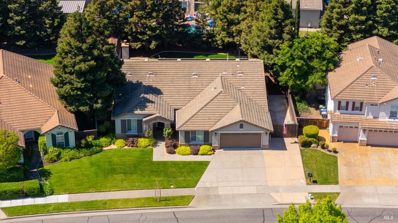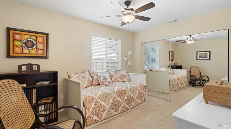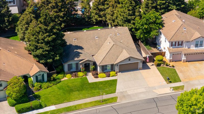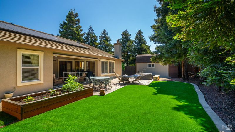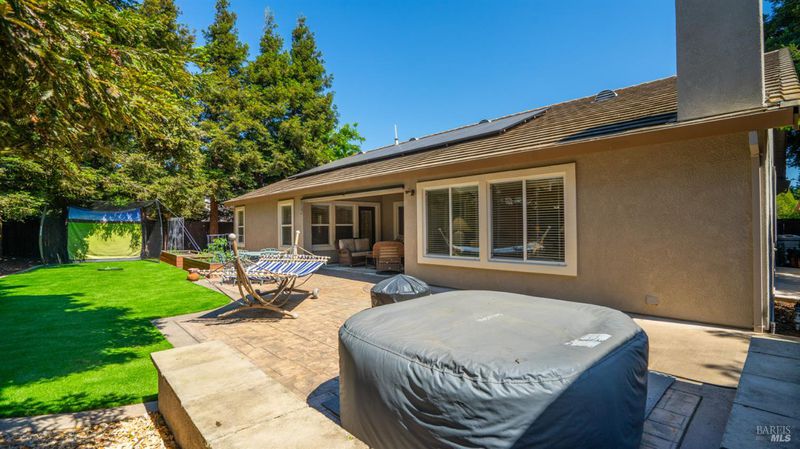 Located in the desirable Vintage Green Valley neighborhood, this single-story former model home offers a private, light-filled retreat on a generous lot with mature trees. The heart of the home is an updated kitchen featuring new countertops, a four-burner cooktop, wall-mounted oven, and a breakfast bar, flowing seamlessly into a family room with a cozy fireplace and built-in entertainment center. French doors open to a peaceful backyard oasis with a covered stamped-concrete patio and low-maintenance turf. Both inside and outside there is plenty of room for entertaining, relaxing, and making memories. Flexible living spaces include a den with a built-in office suite and a primary bedroom boasting its own fireplace and backyard access. High-value practical upgrades include paid-off solar, a new heat pump/furnace, new overhead ceiling fans, and new LeafFilter gutter system. With a two-car garage, storage shed/workshop, and RV-capable side access, this home combines luxury with convenience, situated just minutes from the Green Valley Country Club, shopping, dining, library, and commuter routes to Napa or the Bay Area.