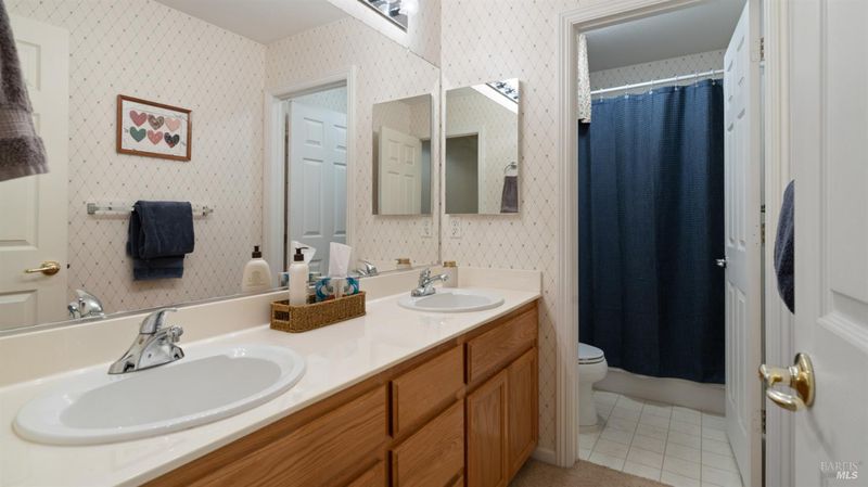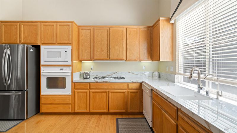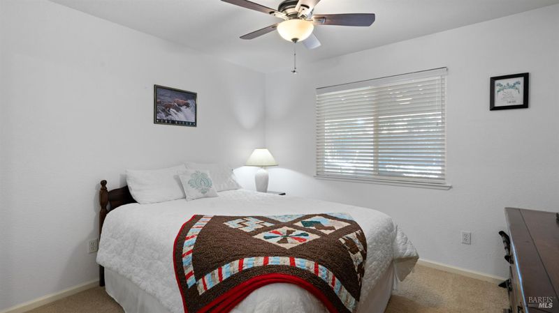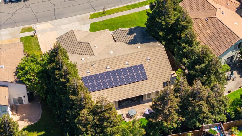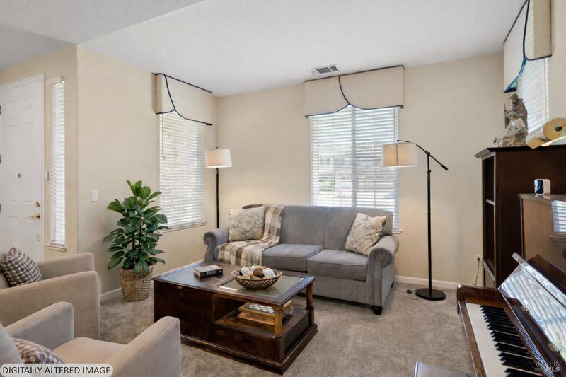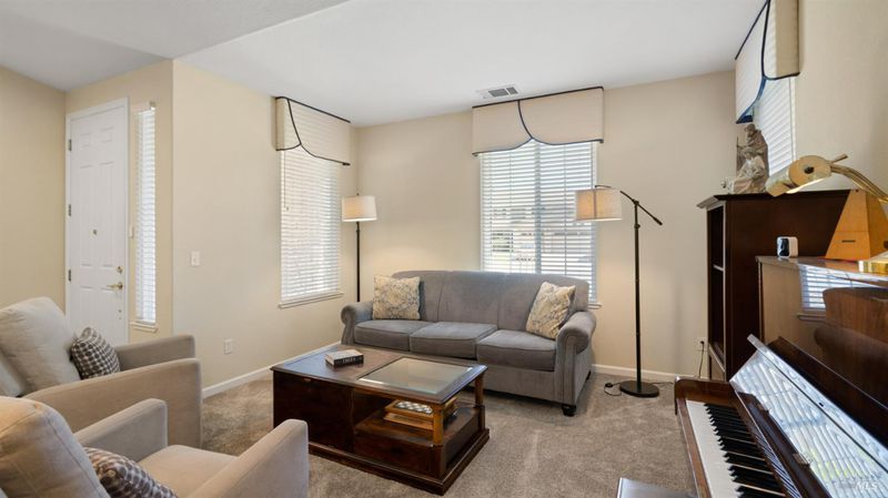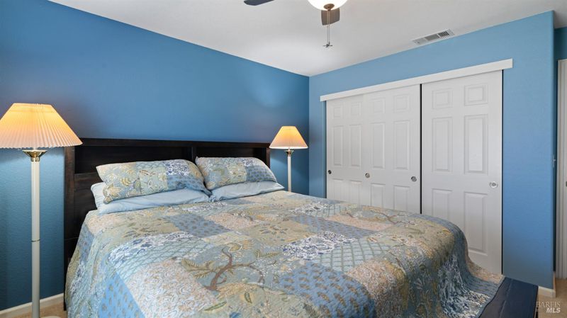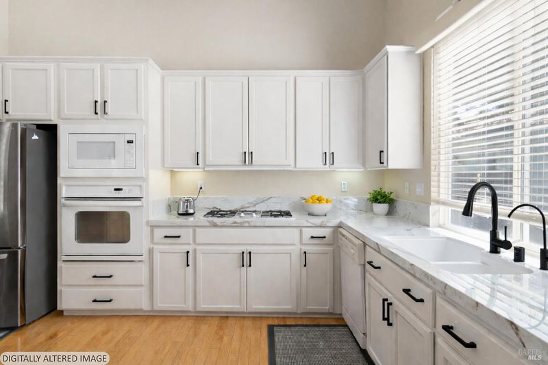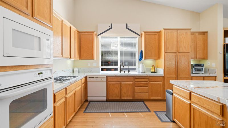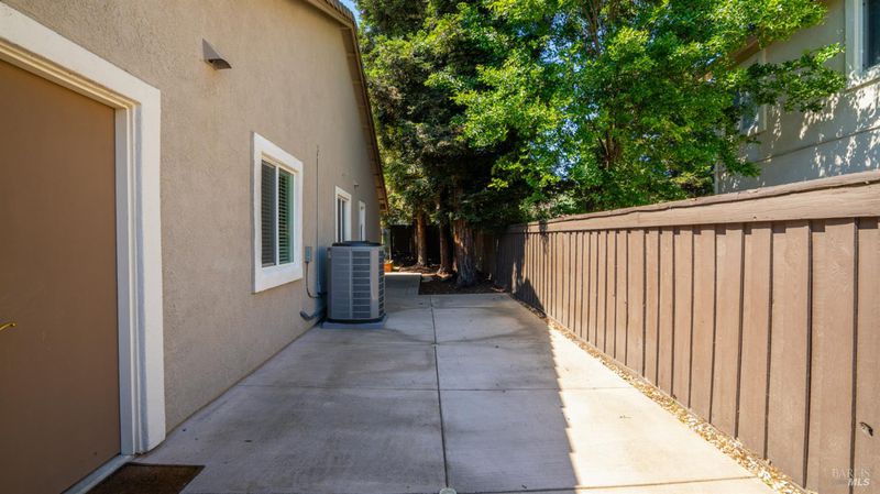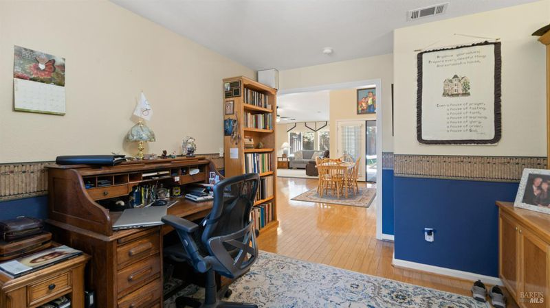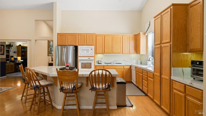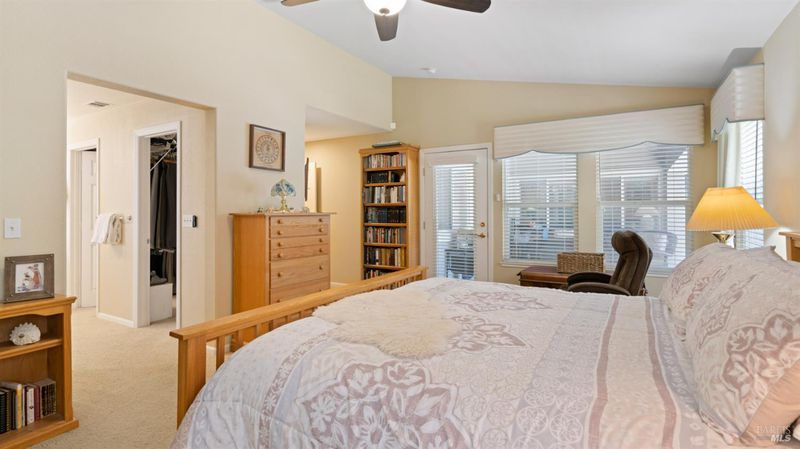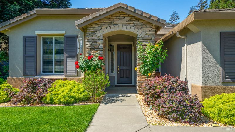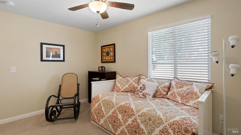 Located in the desirable Vintage Green Valley neighborhood, this single-story former model home offers a private, light-filled retreat on a generous lot with mature trees. The heart of the home is an updated kitchen featuring new countertops, a four-burner cooktop, wall-mounted oven, and a breakfast bar, flowing seamlessly into a family room with a cozy fireplace and built-in entertainment center. French doors open to a peaceful backyard oasis with a covered stamped-concrete patio and low-maintenance turf. Both inside and outside there is plenty of room for entertaining, relaxing, and making memories. Flexible living spaces include a den with a built-in office suite and a primary bedroom boasting its own fireplace and backyard access. High-value practical upgrades include paid-off solar, a new heat pump/furnace, new overhead ceiling fans, and new LeafFilter gutter system. With a two-car garage, storage shed/workshop, and RV-capable side access, this home combines luxury with convenience, situated just minutes from the Green Valley Country Club, shopping, dining, library, and commuter routes to Napa or the Bay Area.