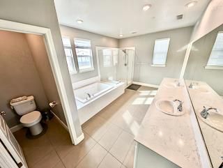 - Double Sinks, Full on Ground Floor, Primary - Oversized Tub, Primary - Stall Shower(s), Shower and Tub, Stall Shower, Tile